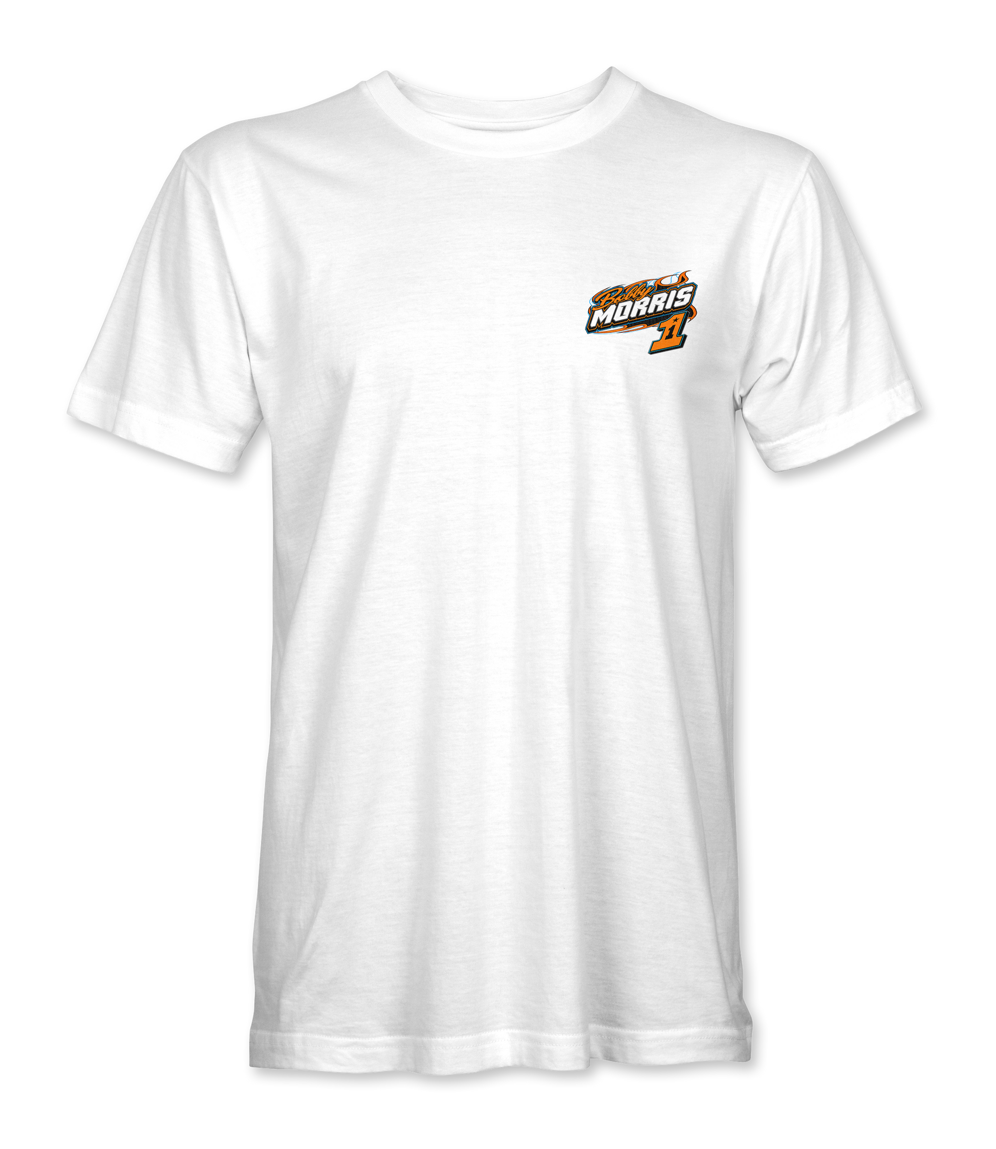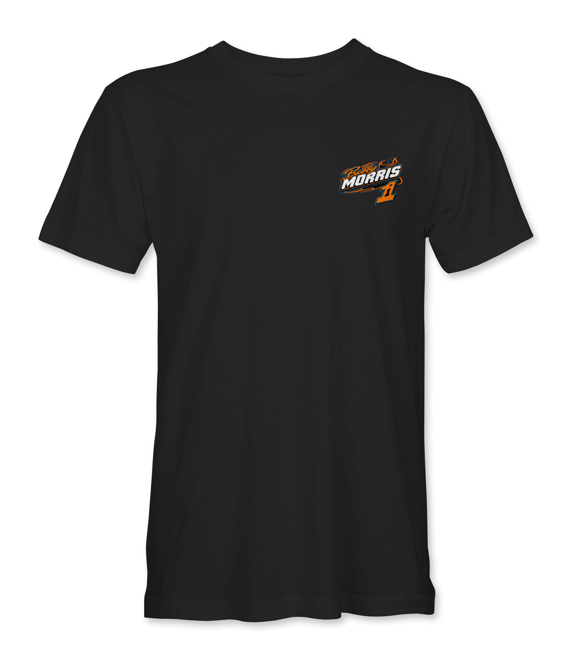 Support Bobby Morris with their custom apparel! Available in Black, Sports Gray and White. Graphics are direct to garment printed with a left chest image and a full back image.