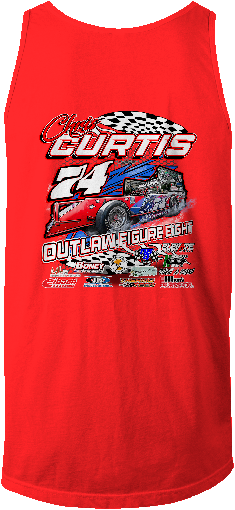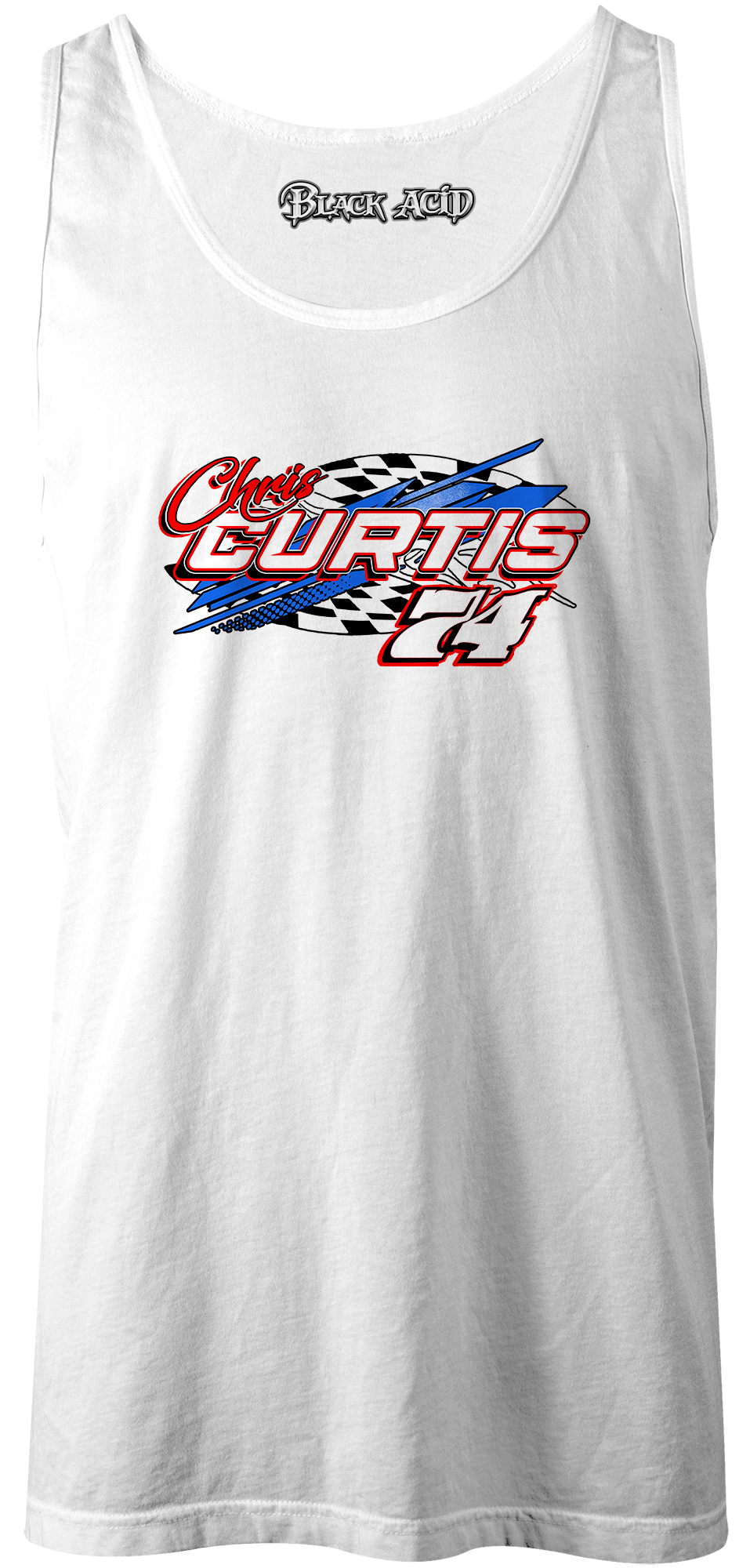 Support Chris Curtis and his team with their custom apparel! Available in Black, White, Blue & Red. Graphics are direct to garment printed with a left chest image and a full back image.