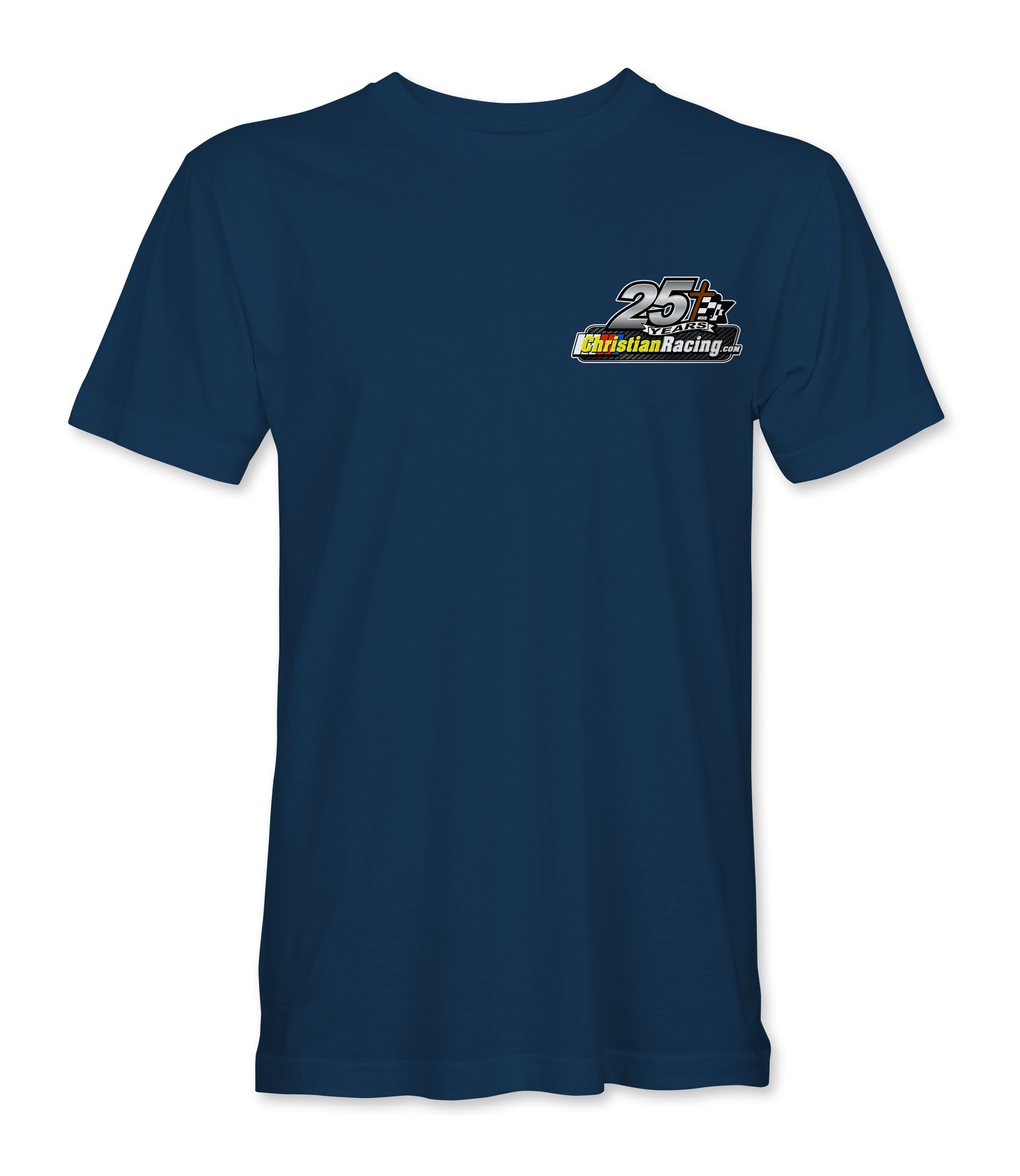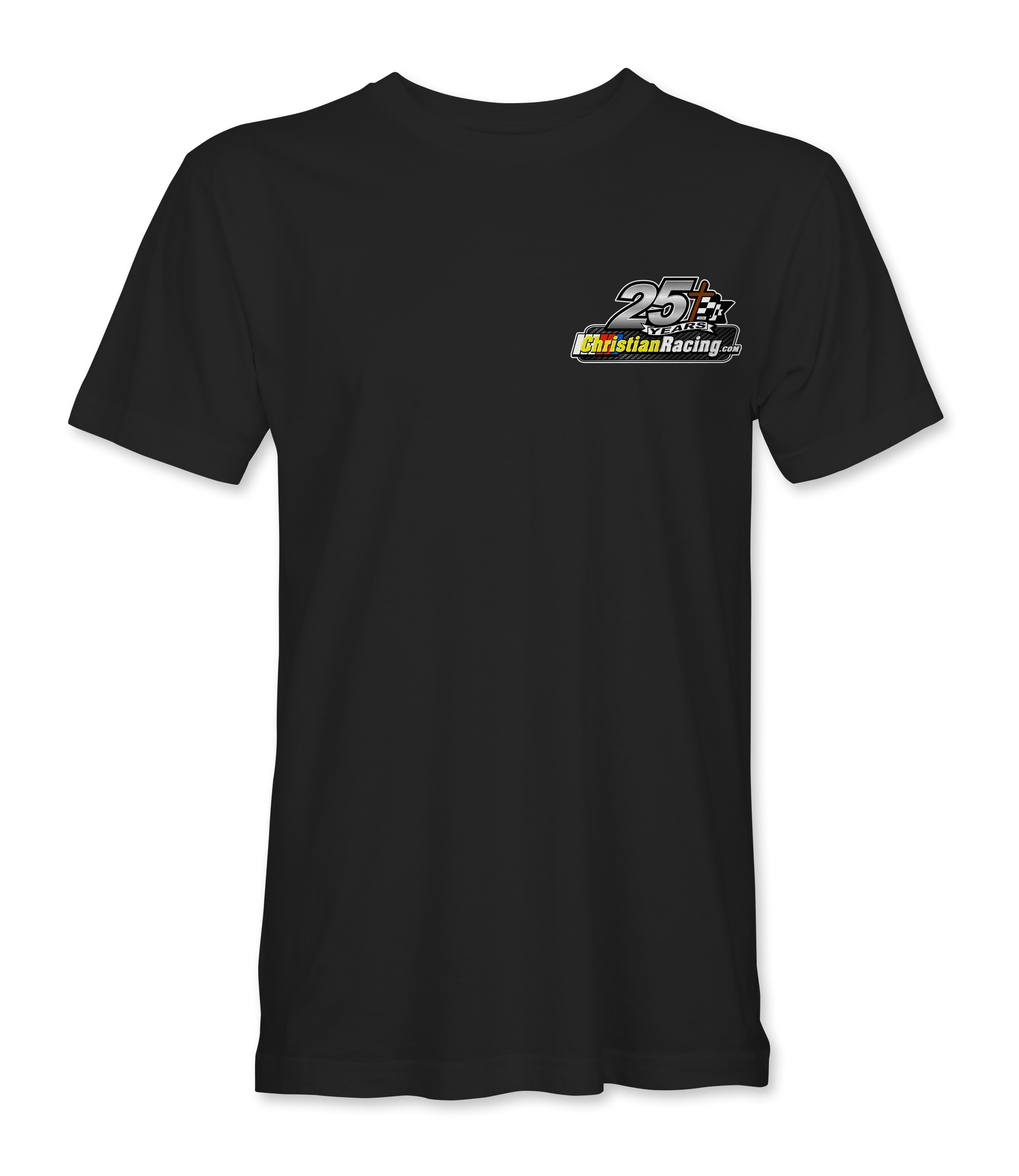 Support Christian Racing with their custom apparel! Available in Black, Sport Gray, Navy and White. Graphics are direct to garment printed with a left chest image and a full back image.