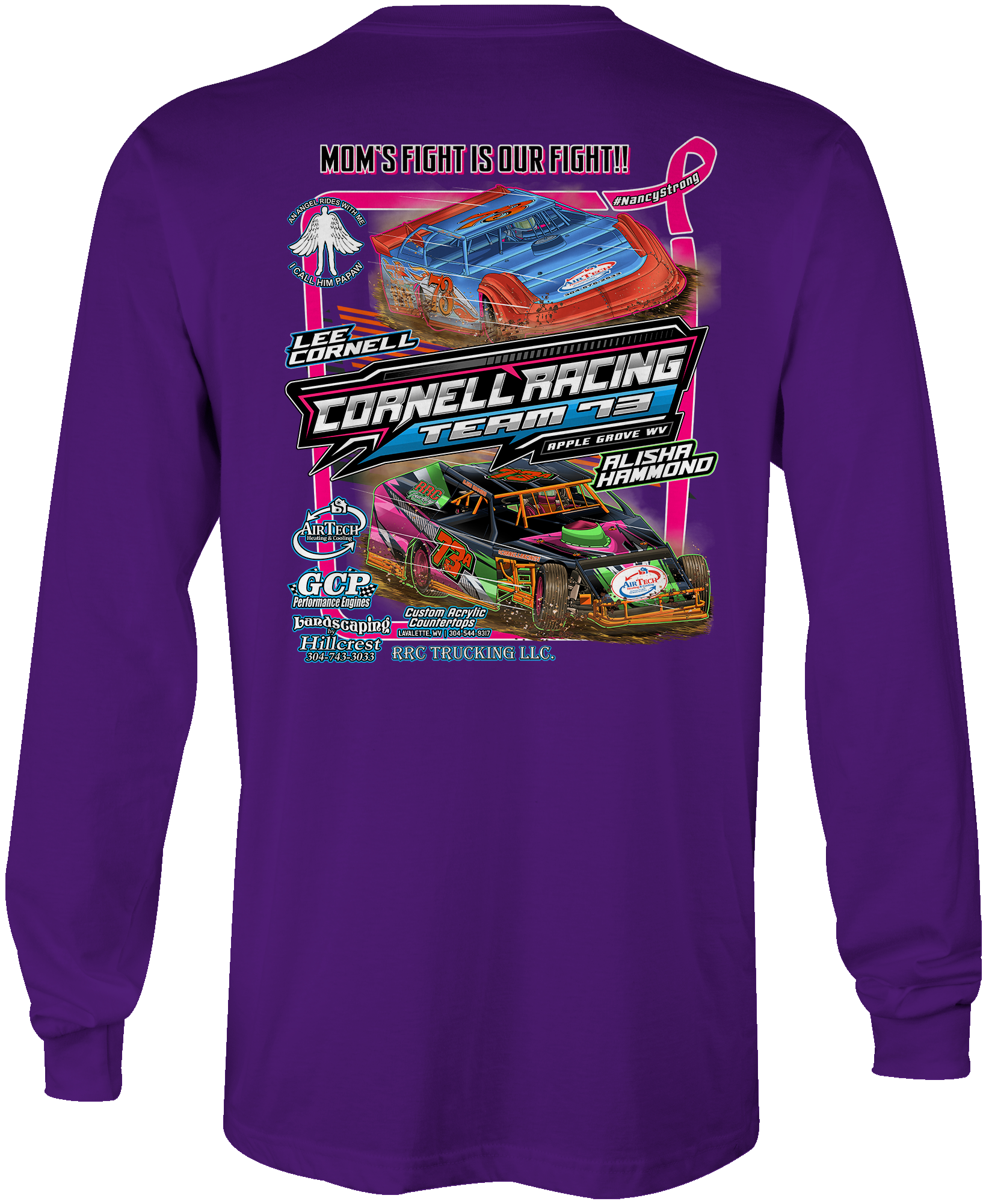 Support Cornell Racing with their custom apparel! Available in Black & Purple. Graphics are direct to garment printed with a left chest image and a full back image.