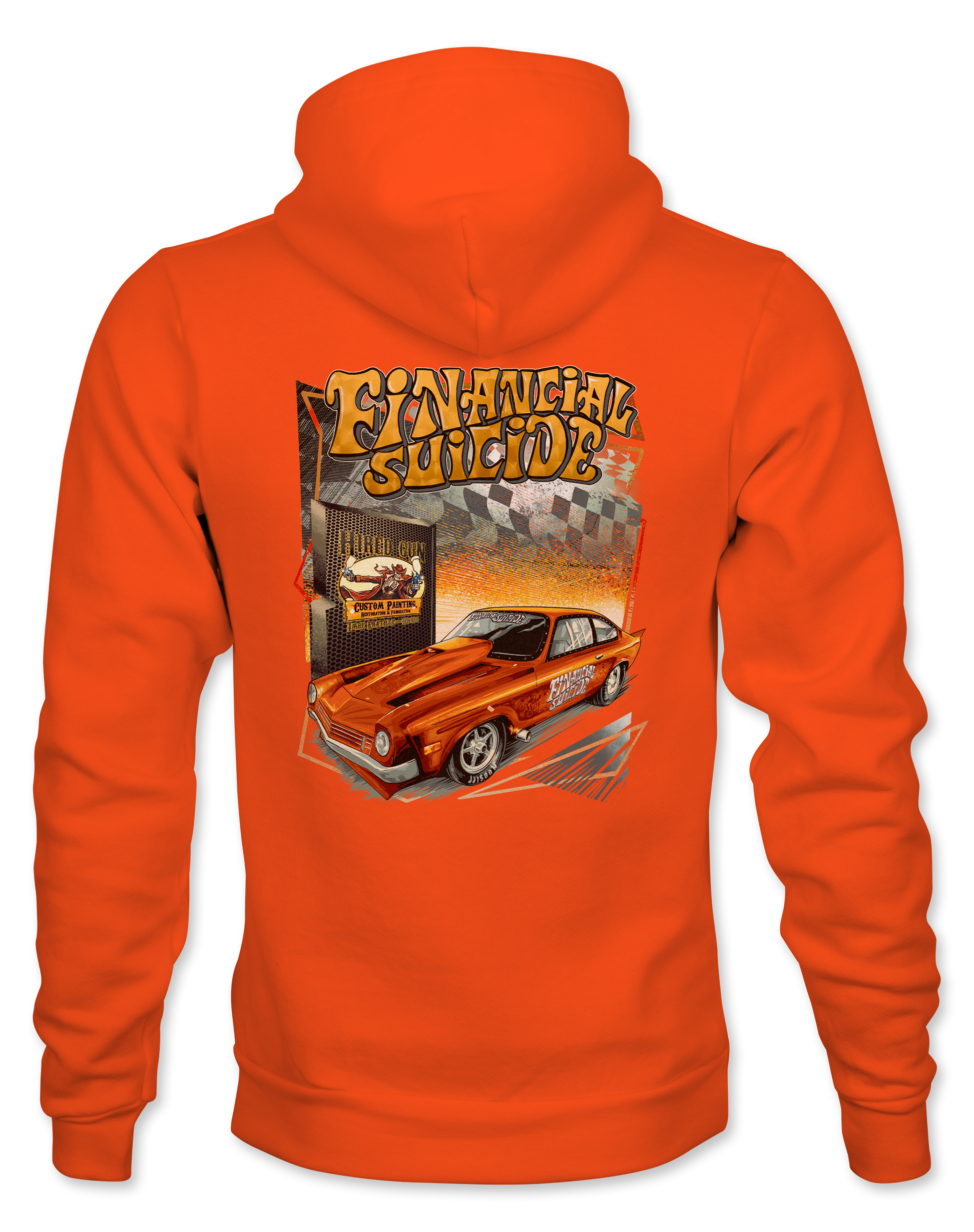 Support Financial Suicide with their custom apparel! Available in Black, Orange, Sport Gray and White. Graphics are direct to garment printed with a left chest image and a full back image.