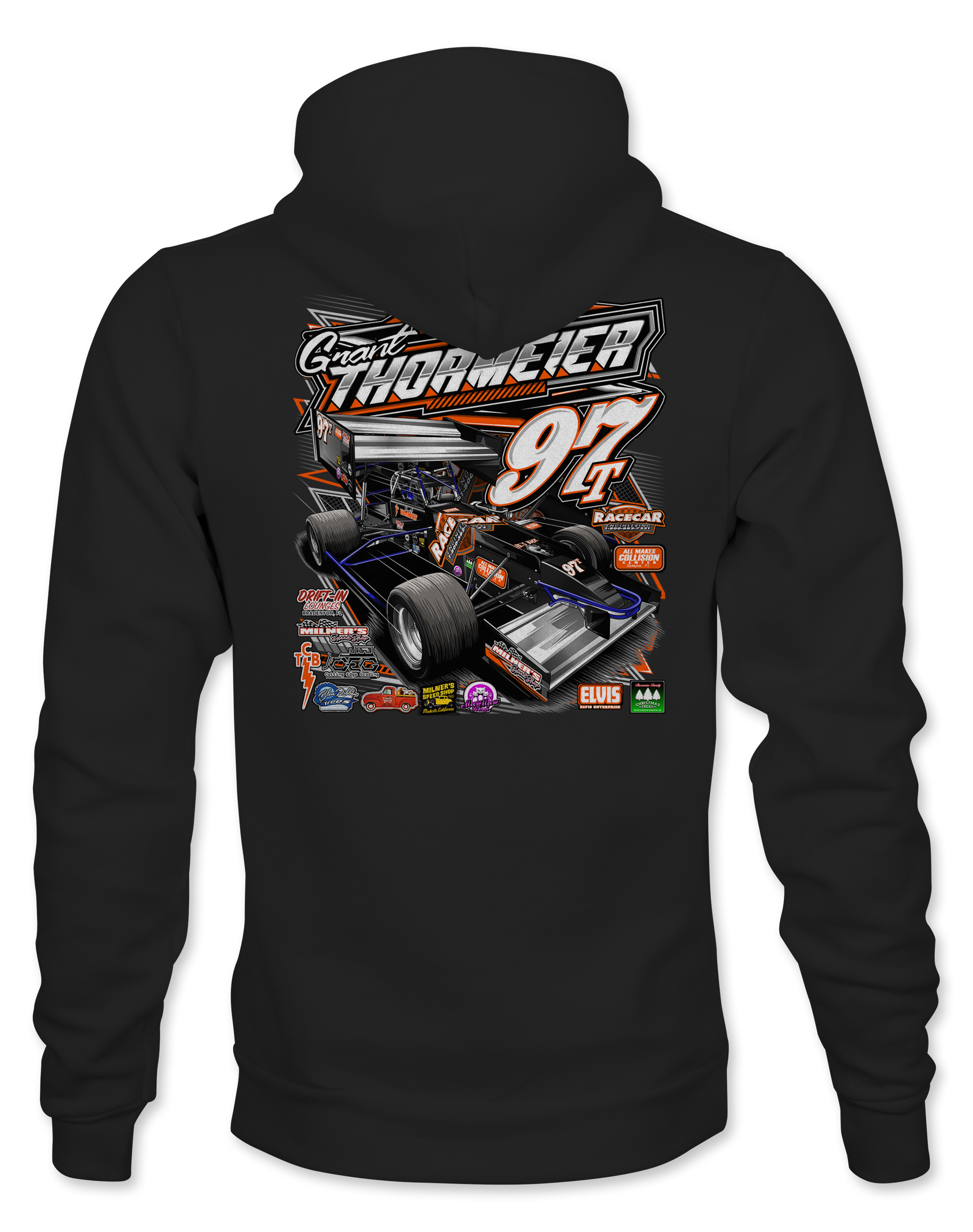 Support Grant Thormeier Super Modified with their custom apparel! Available in Black, Sport Gray and White. Graphics are direct to garment printed with a left chest image and a full back image.