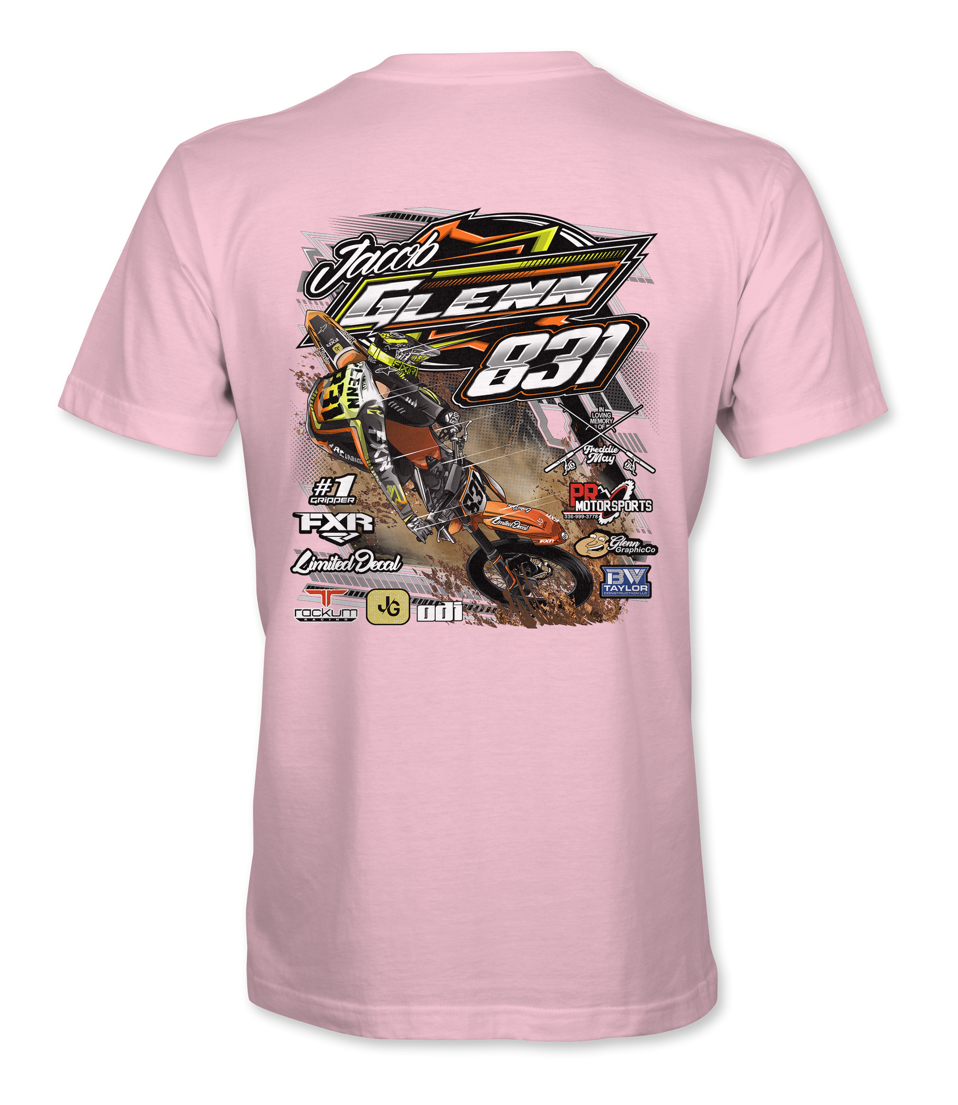 Support Jacob Glenn with their custom apparel! Available in Black, White, Sport Gray, Light Pink, Royal Blue. Graphics are direct to garment printed with a left chest image and a full back image.