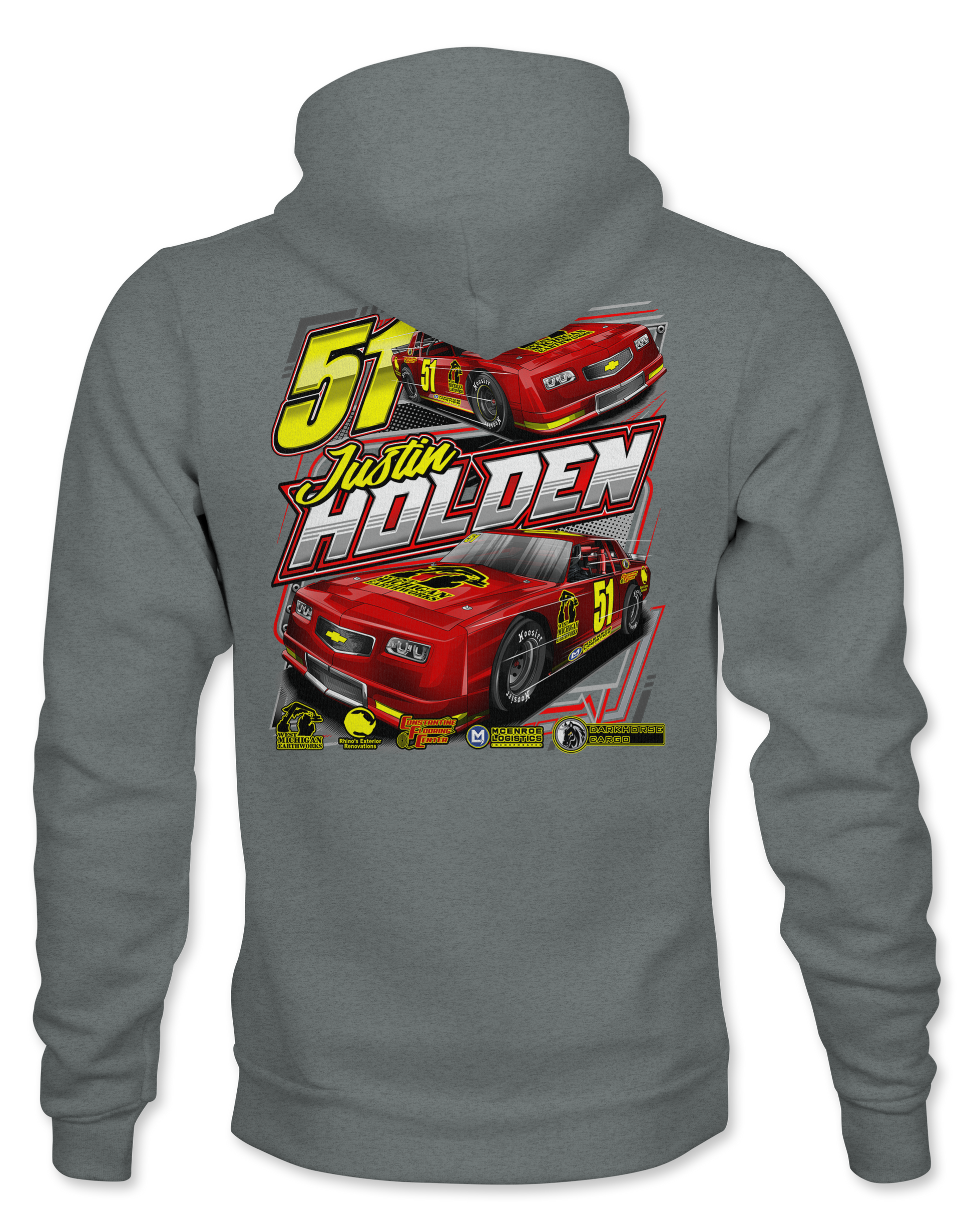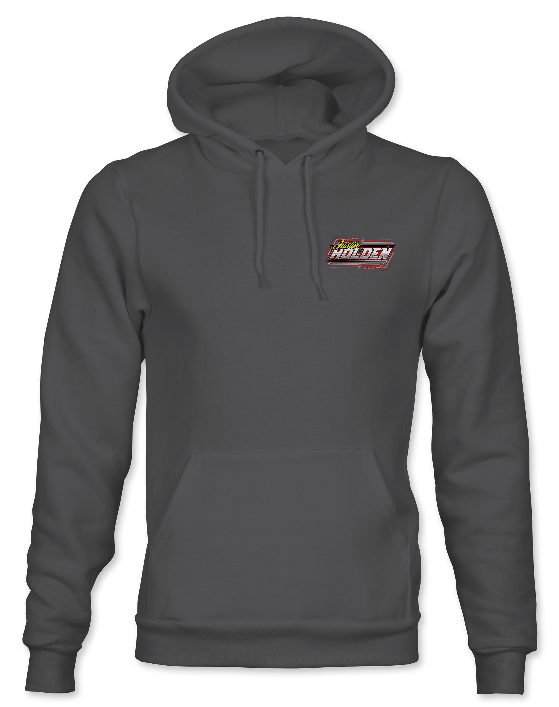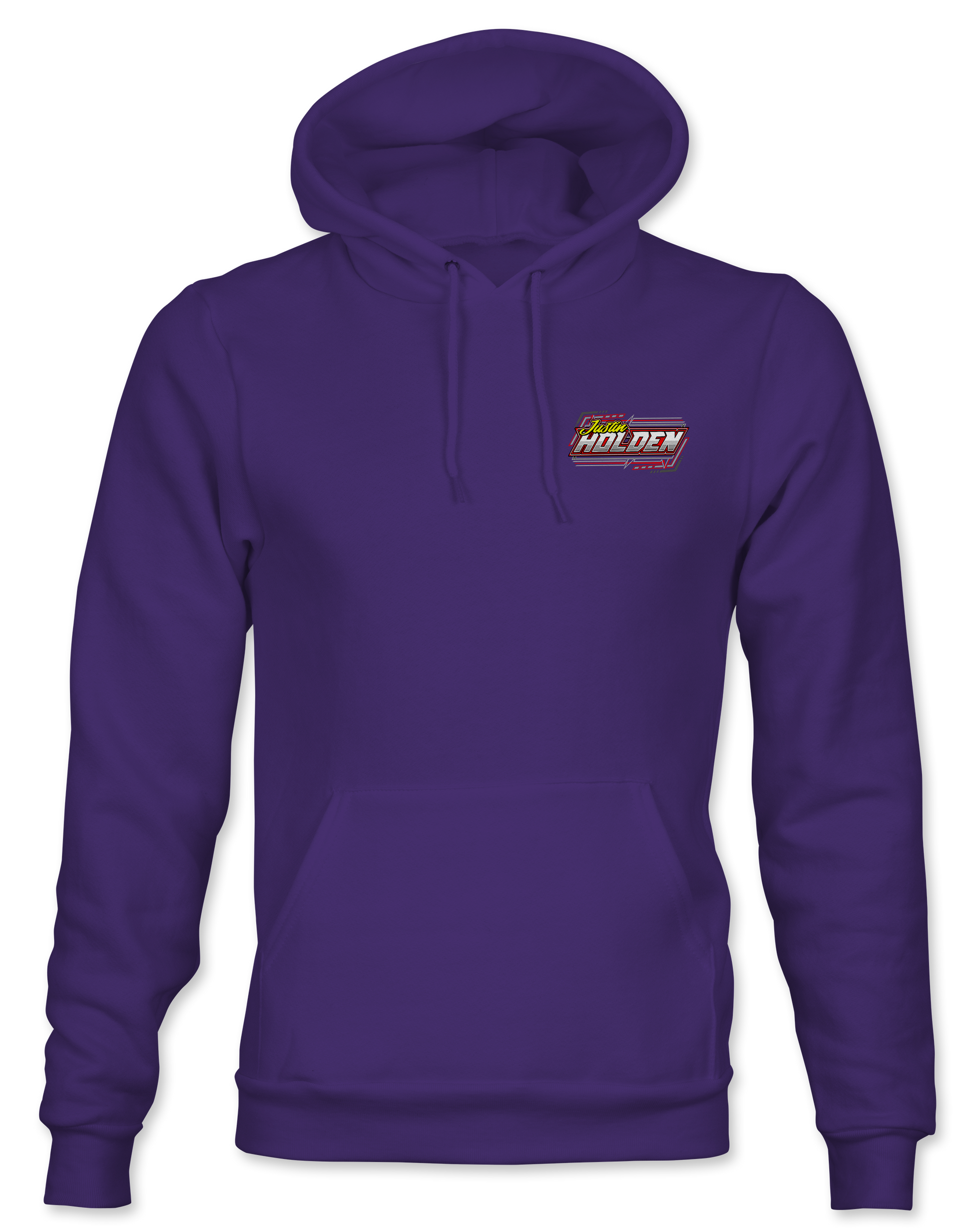 Support Justin Holden and his team with their custom apparel! Available in Black, White, Charcoal, Purple and Safety Yellow. Graphics are direct to garment printed with a left chest image and a full back image.