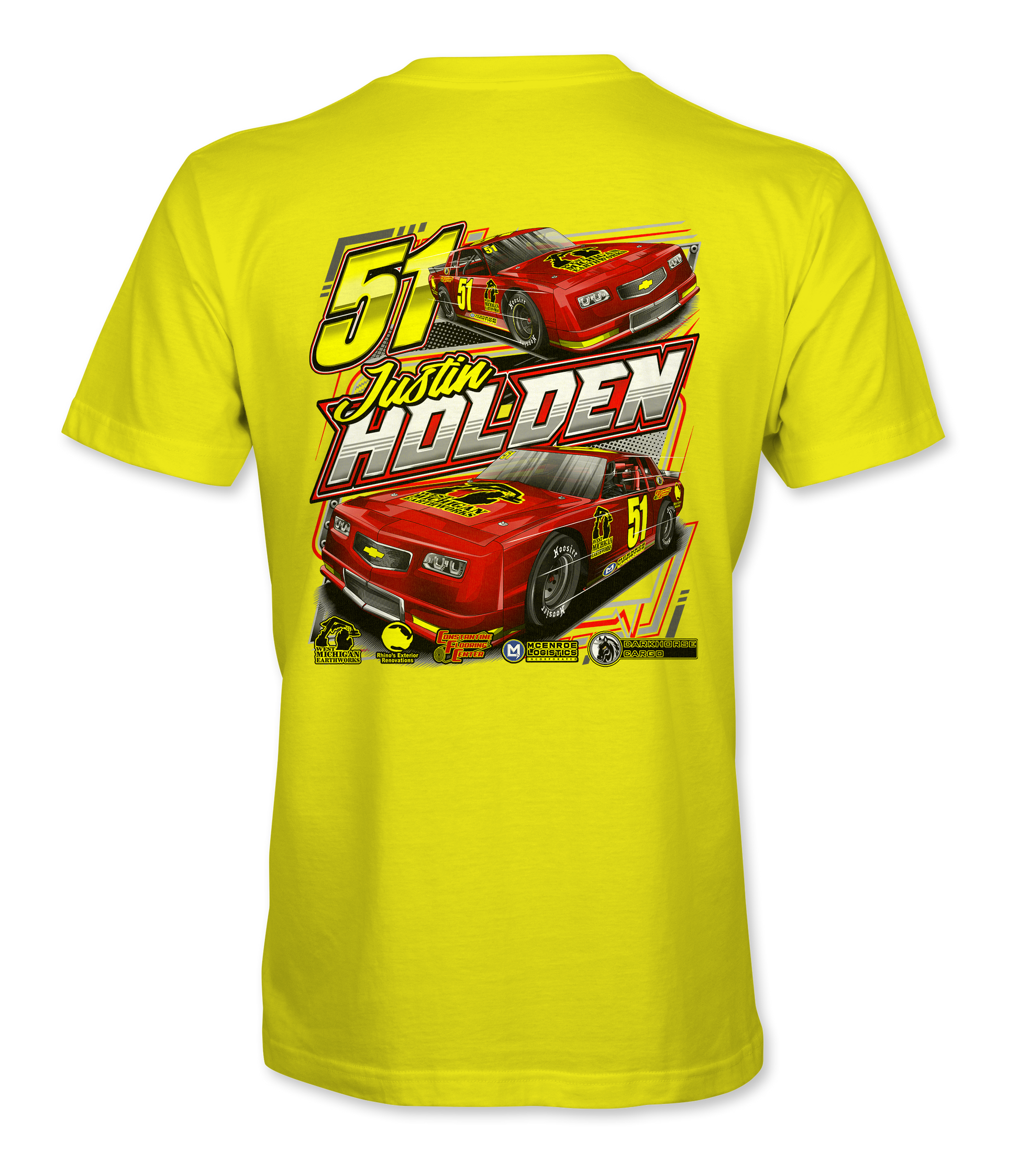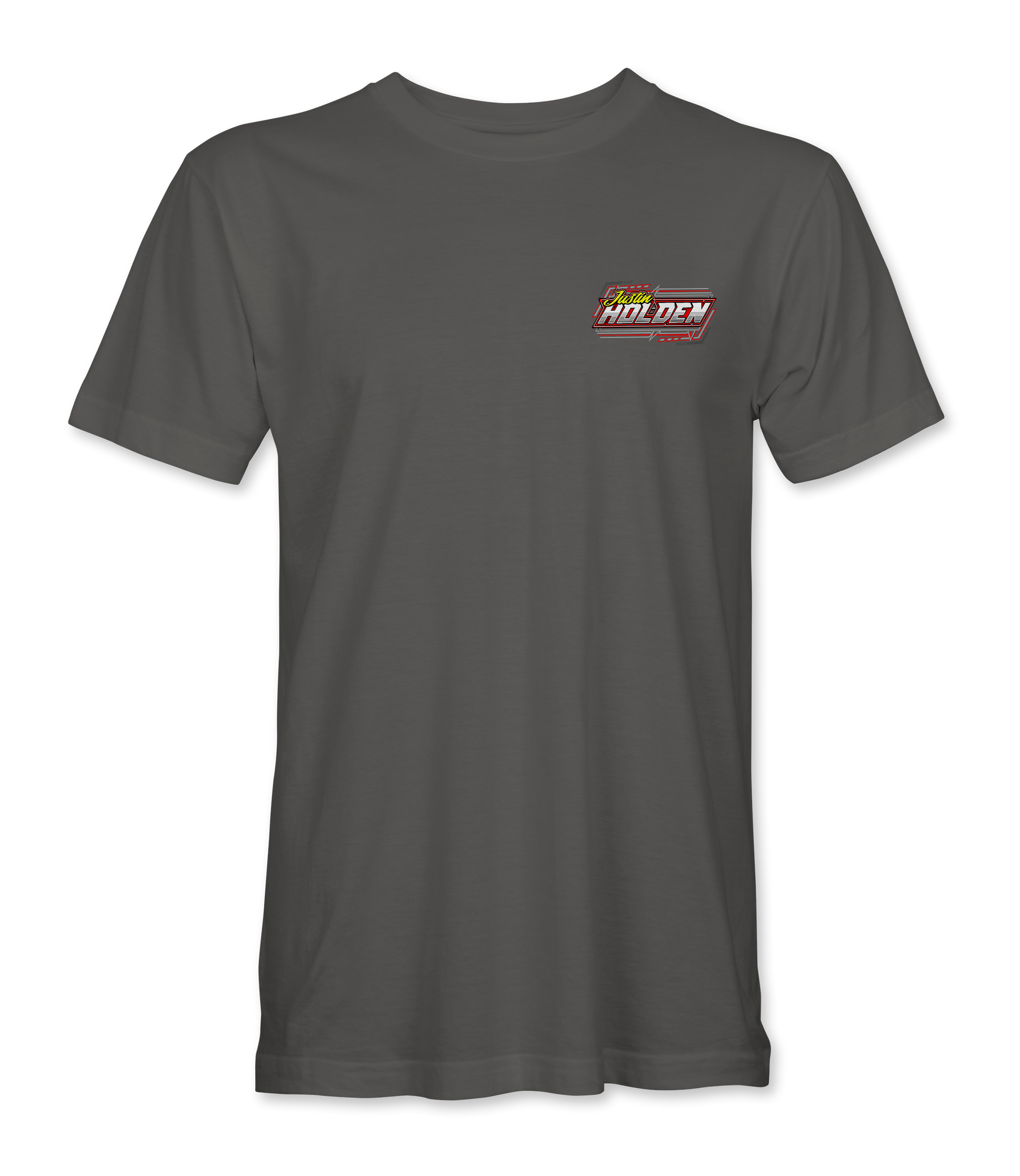 Support Justin Holden and his team with their custom apparel! Available in Black, White, Charcoal, Purple and Safety Green. Graphics are direct to garment printed with a left chest image and a full back image.