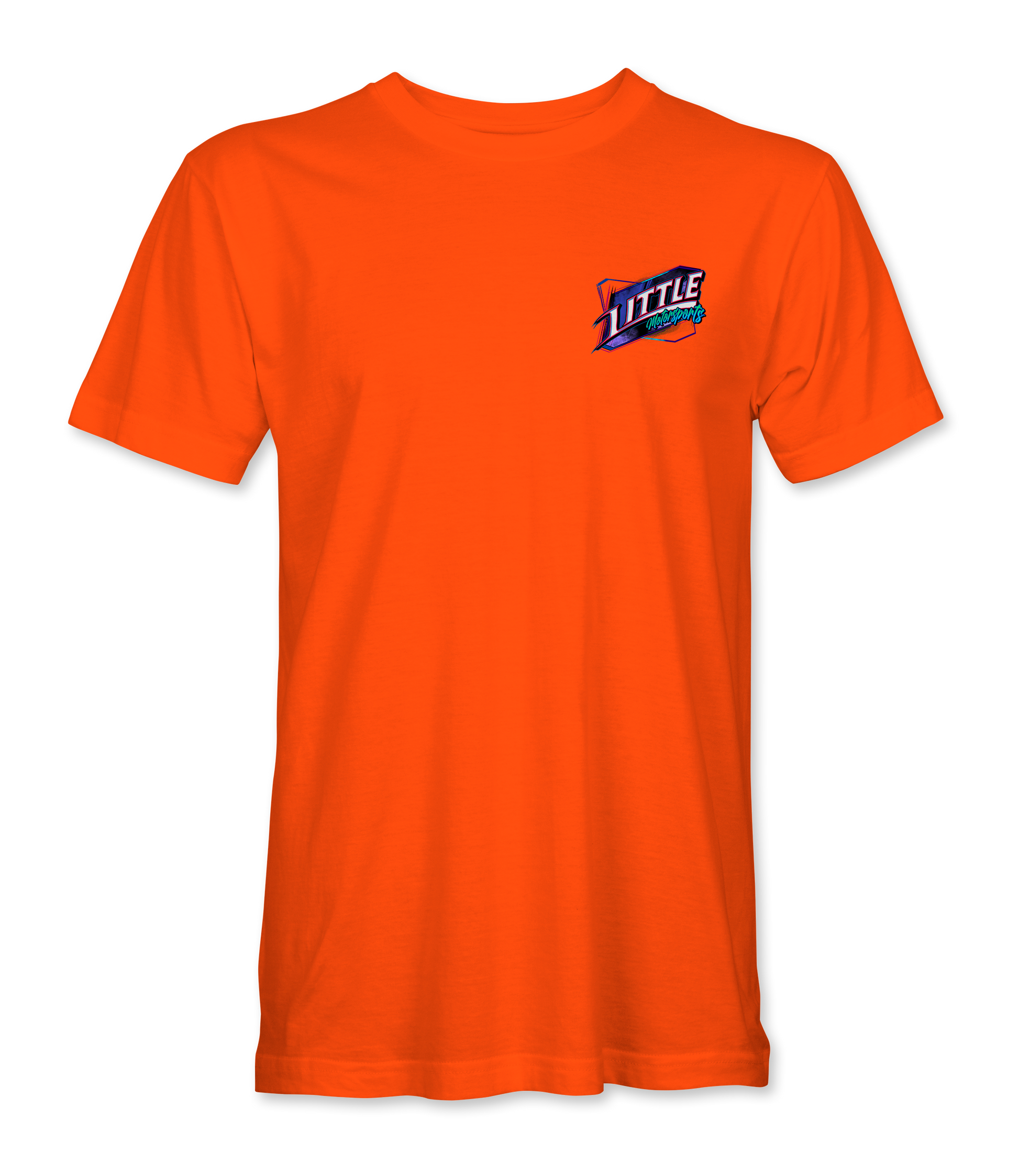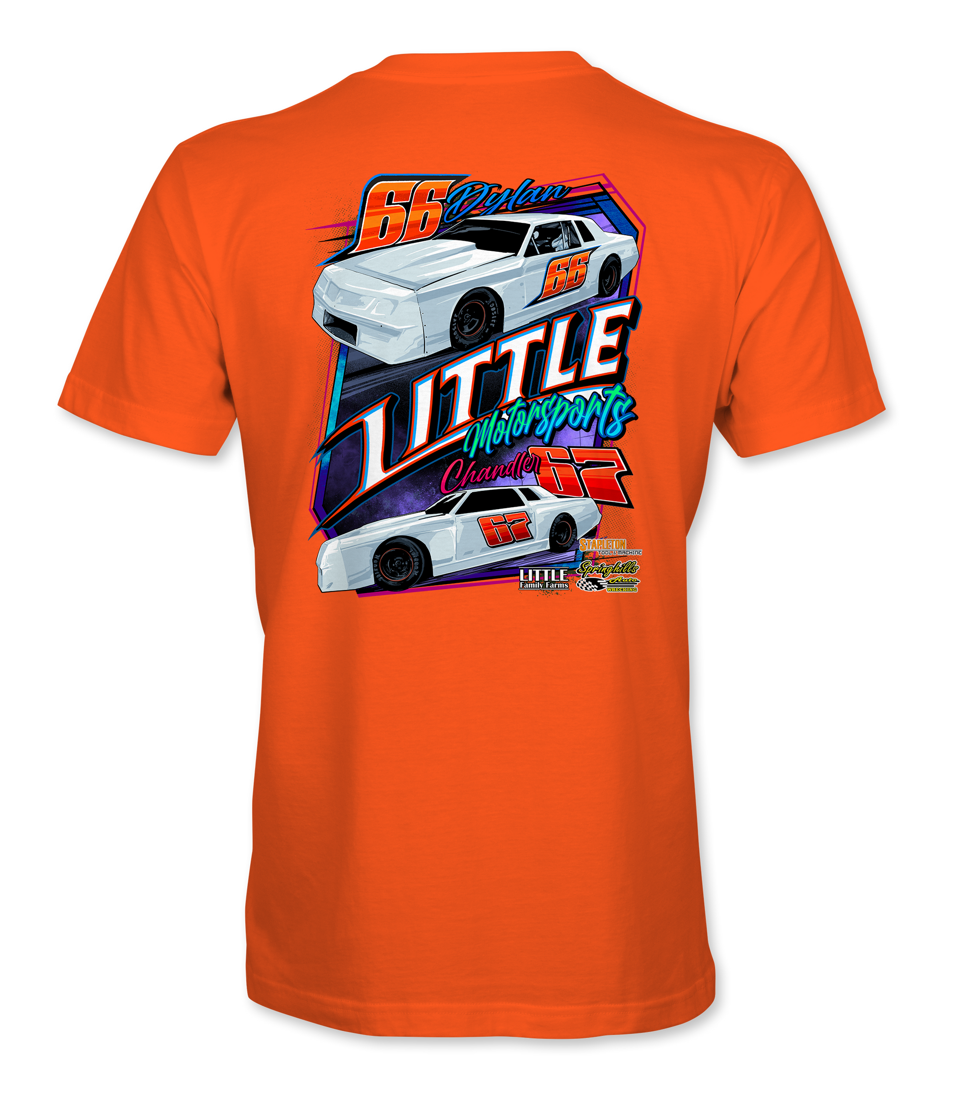 Support the Little Motorsports race team with their custom apparel! Available in Orange, Blue, Red, Sport Gray and Pink. Graphics are direct to garment printed with a left chest image and a full back image.