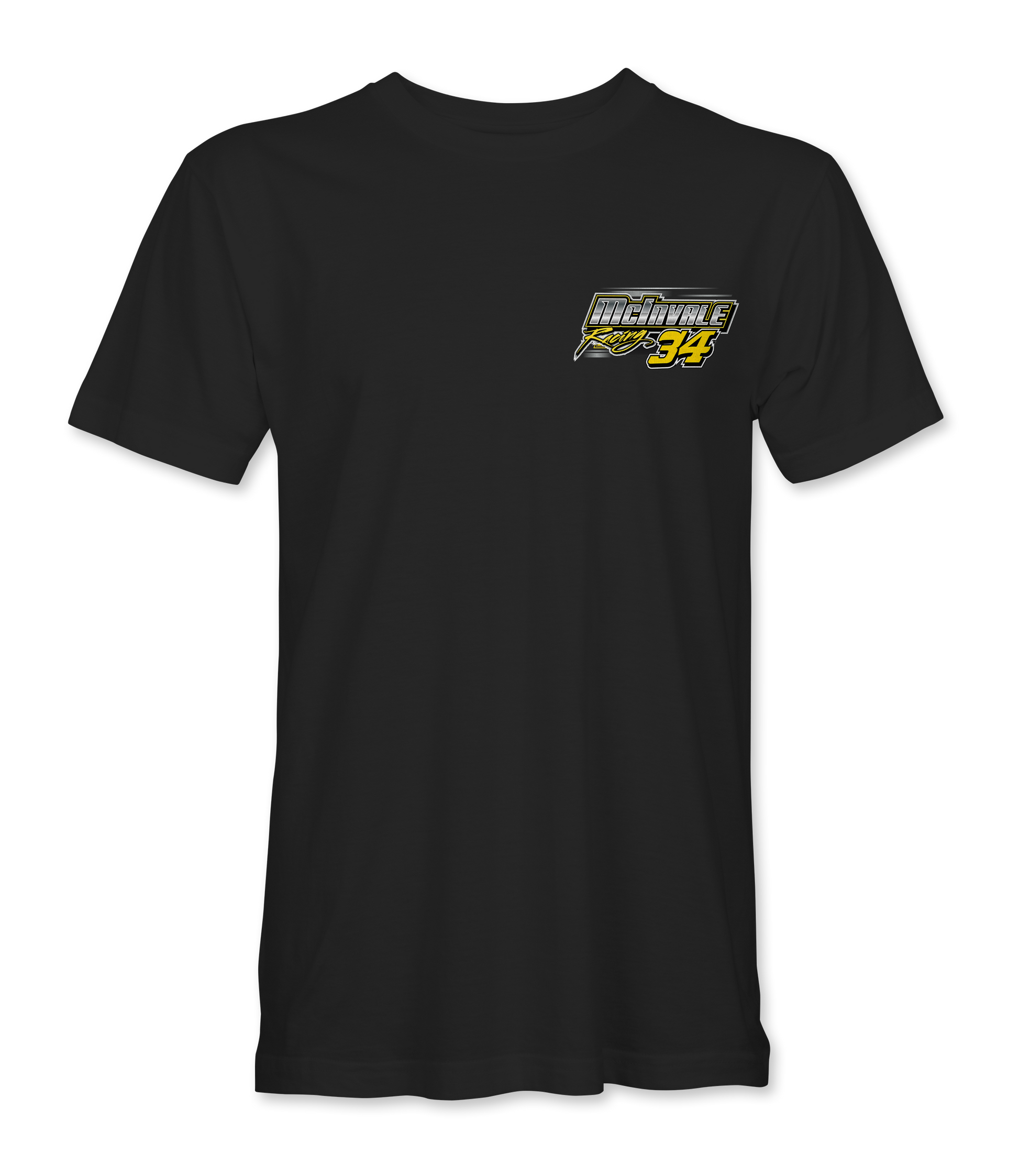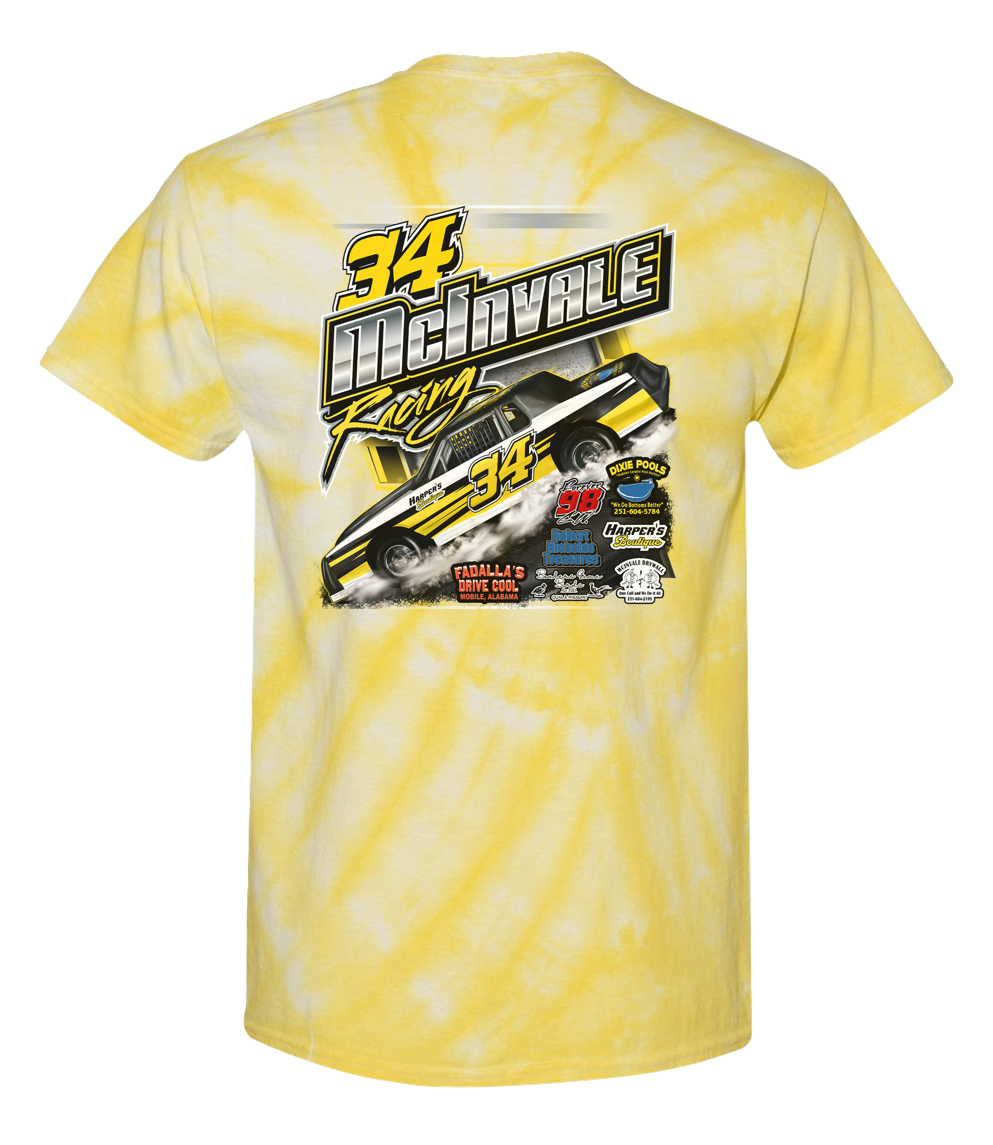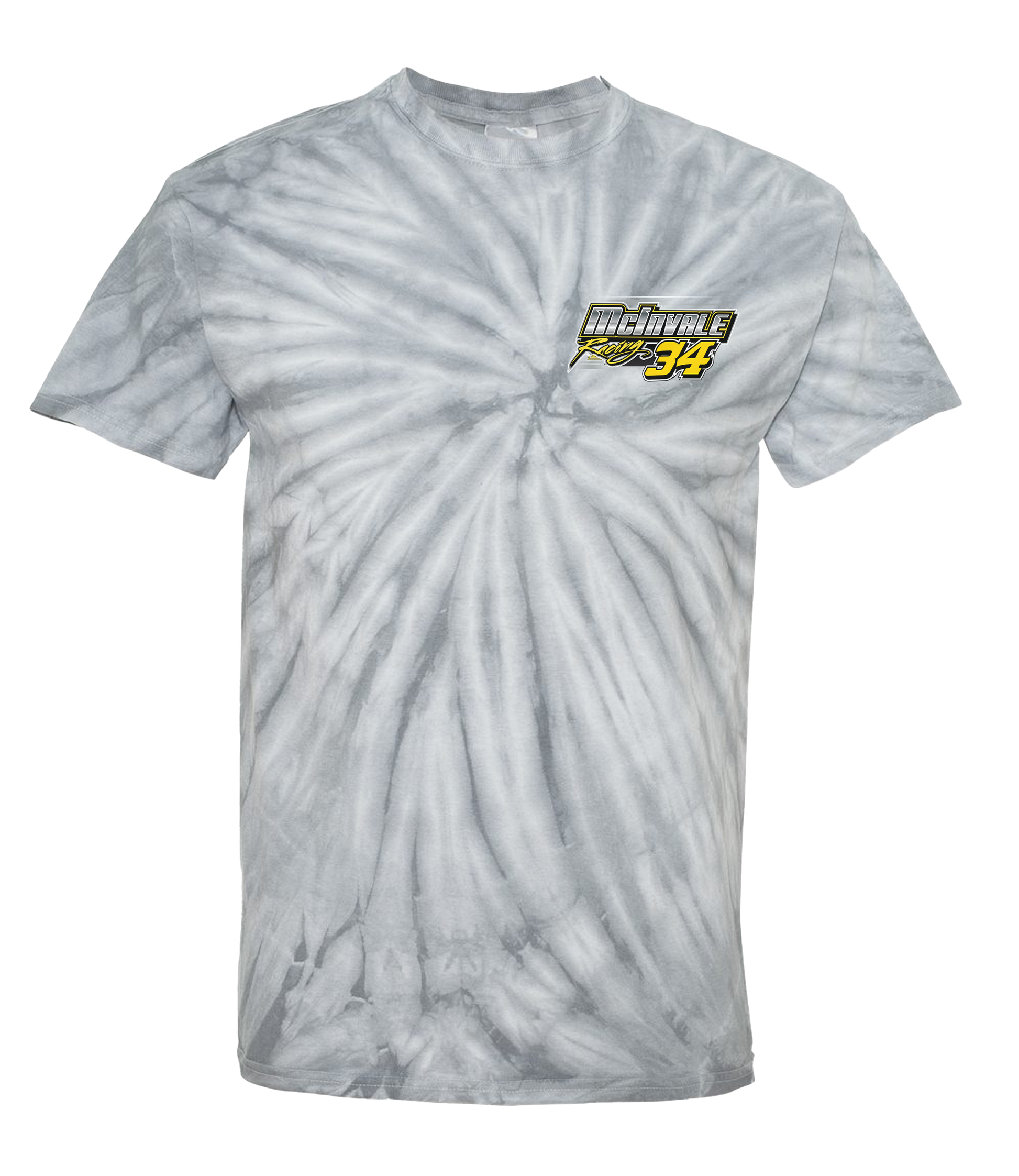 Support McInvale Racing and their team with their custom apparel! Available in Black Tie Dye, Silver Tie Dye, and Yellow Tie Dye. Graphics are direct to garment printed with a left chest image and a full back image.