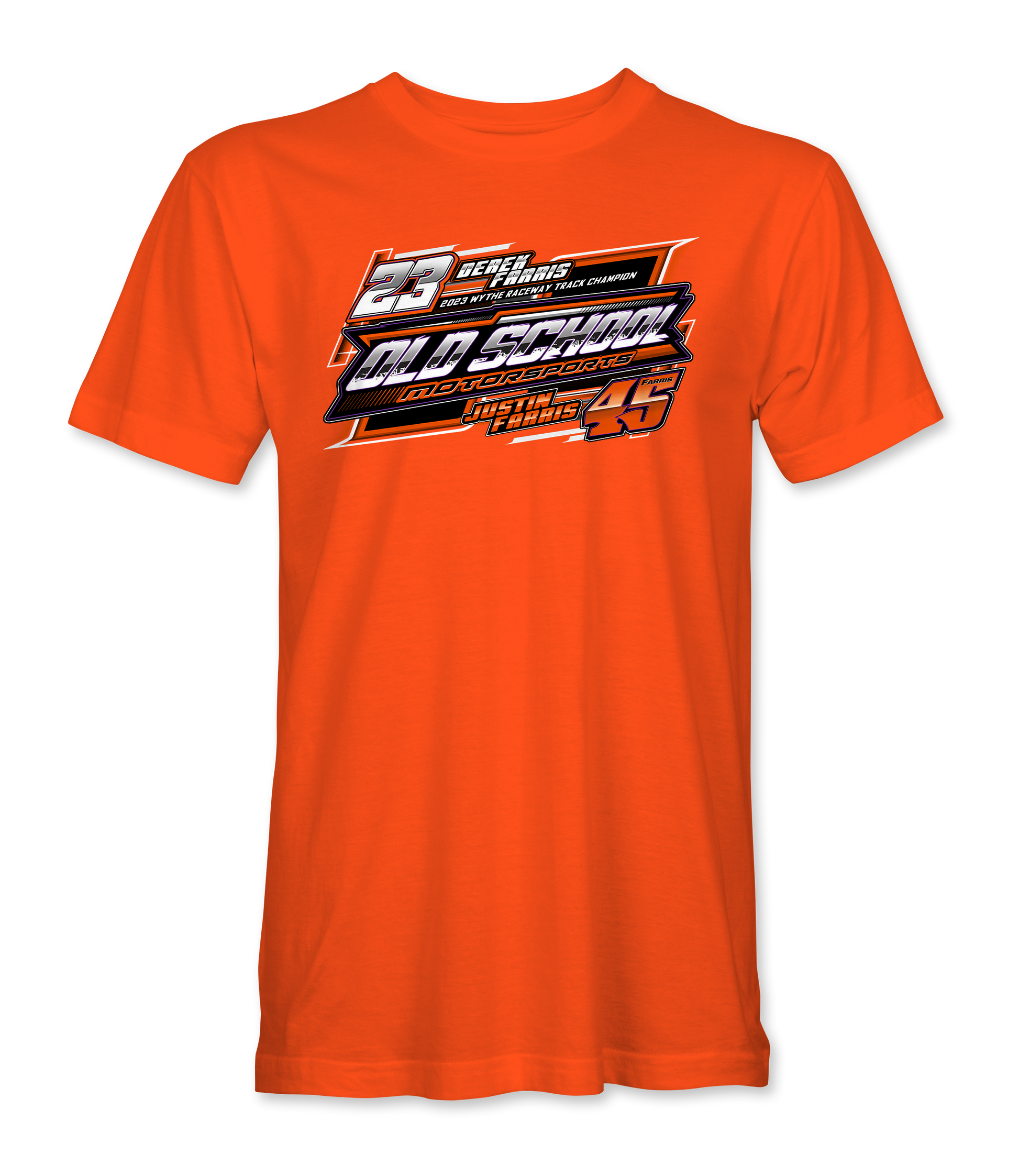 Support Old School Motorsports with their custom apparel! Available in Black, Charcoal, Sport Gray, White and Orange. Graphics are direct to garment printed with a left chest image and a full back image.