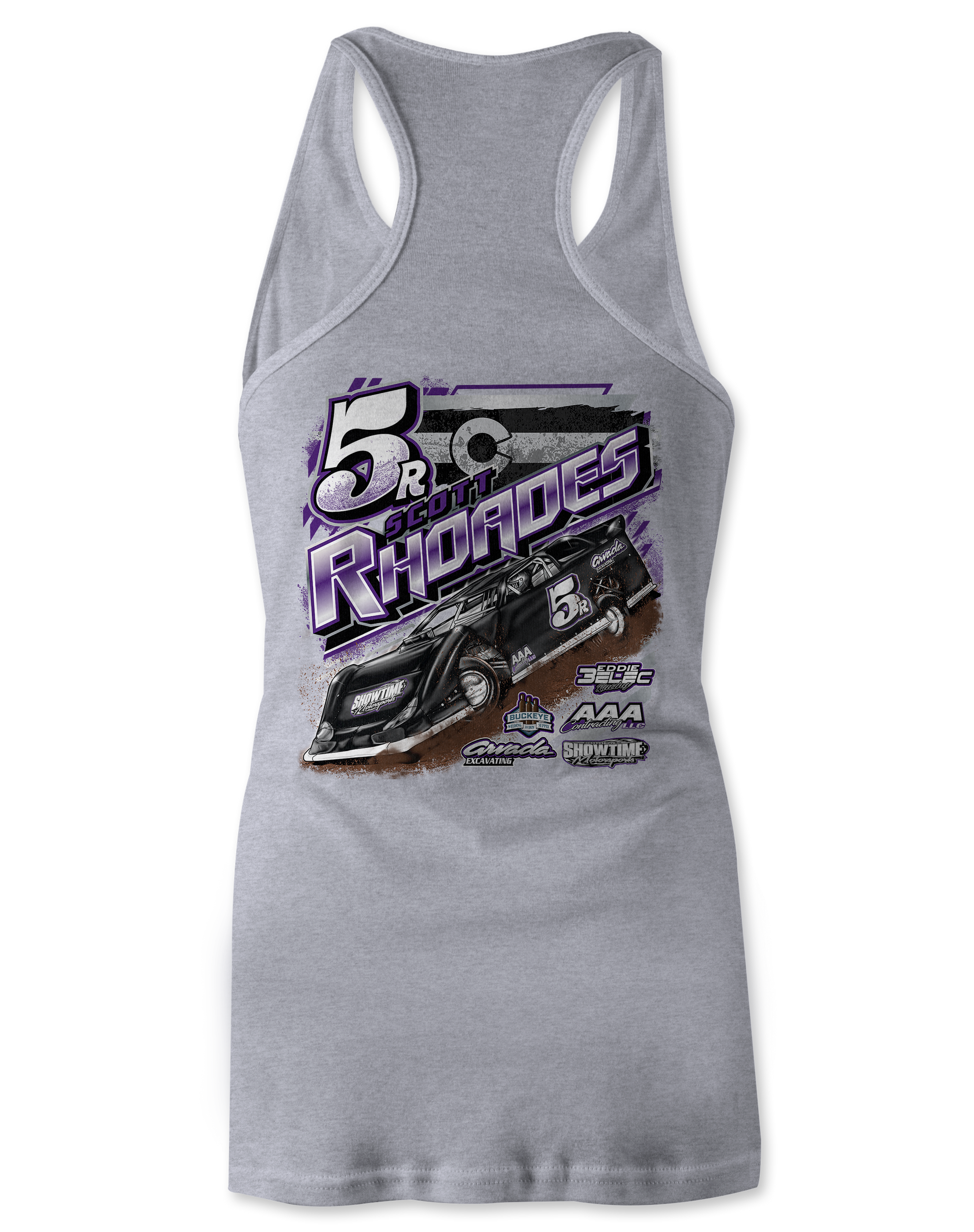 Support Scott Rhoades and his team with their custom apparel! Available in Purple, Black, Sport Gray and White. Graphics are direct to garment printed with a left chest image and a full back image.