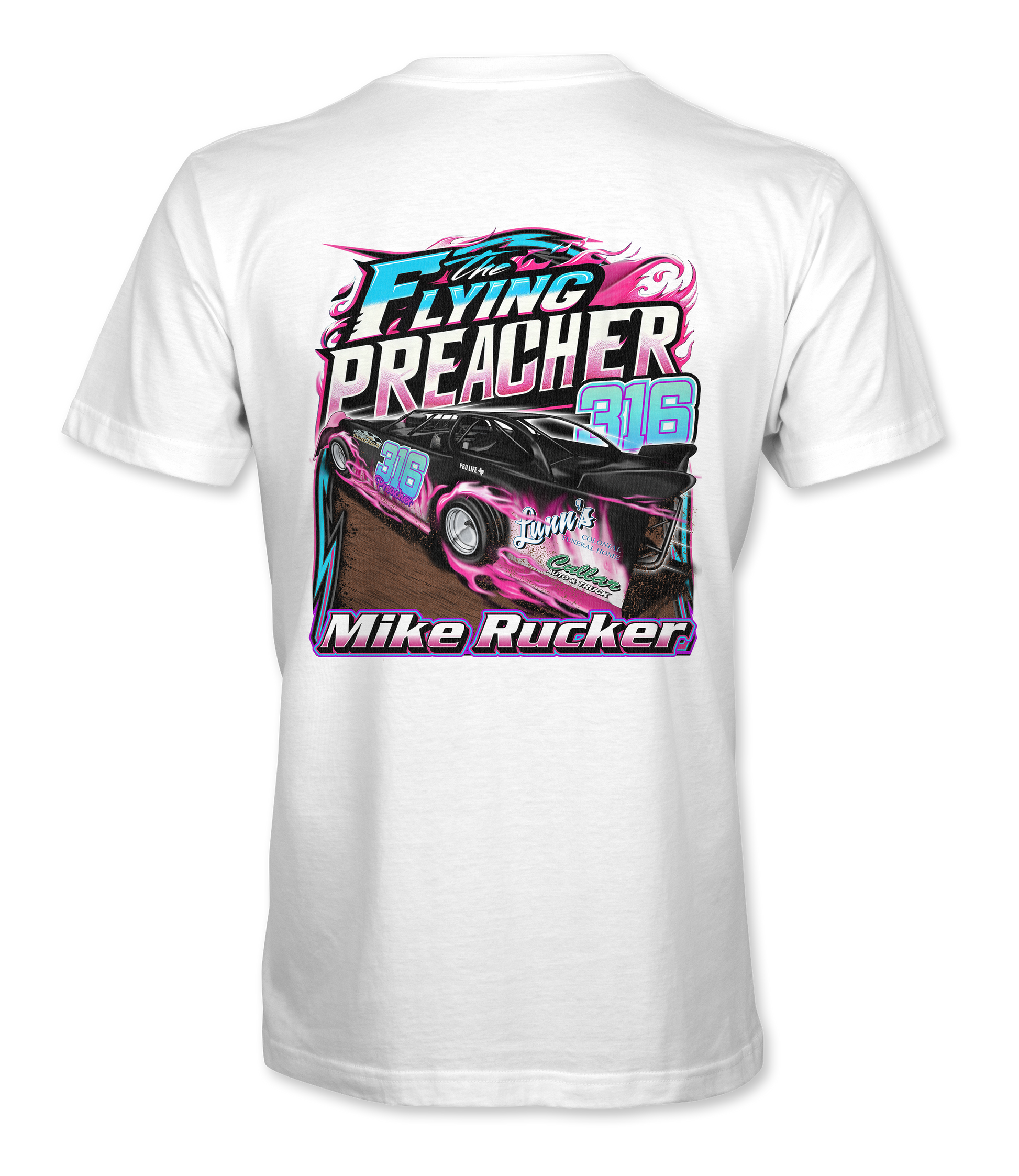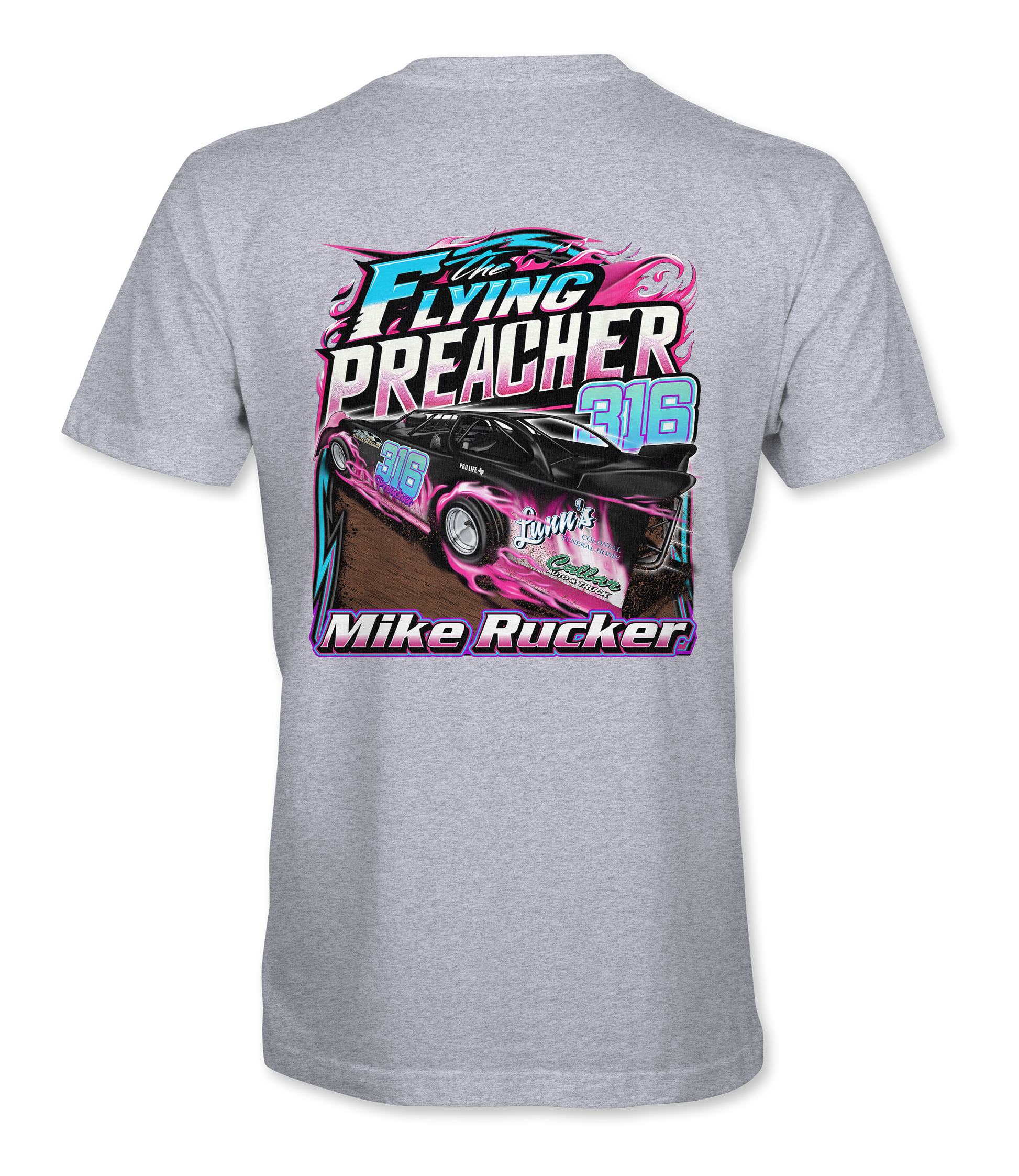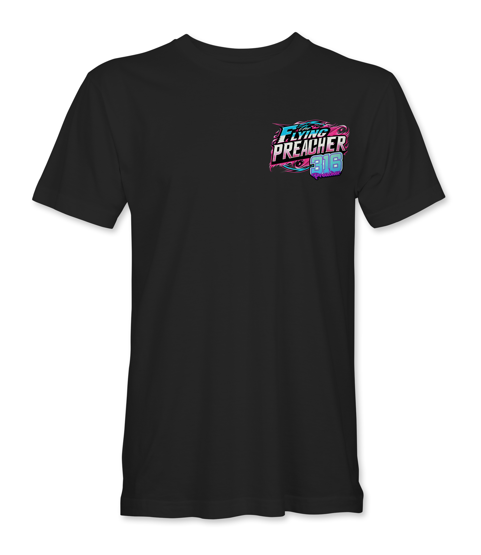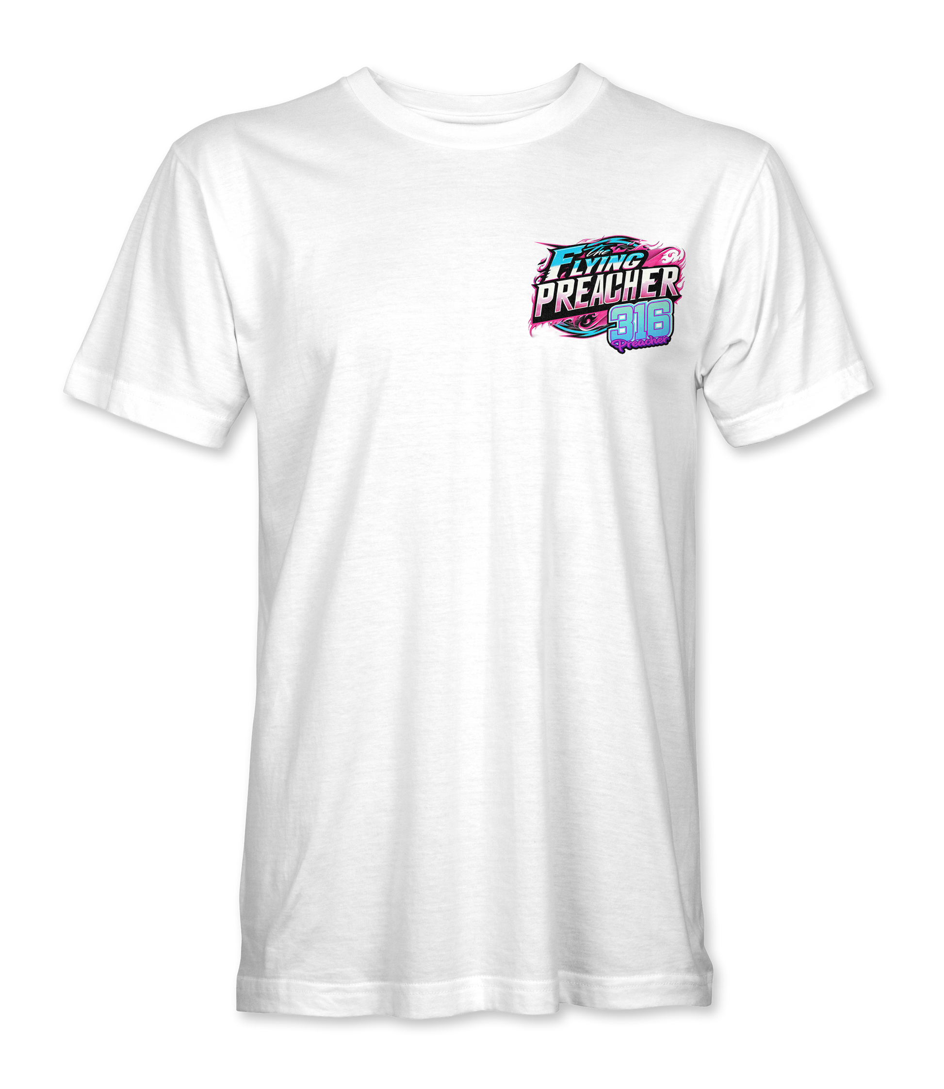 Support The Flying Preacher with their custom apparel! Available in Black, Sport Gray and White. Graphics are direct to garment printed with a left chest image and a full back image.