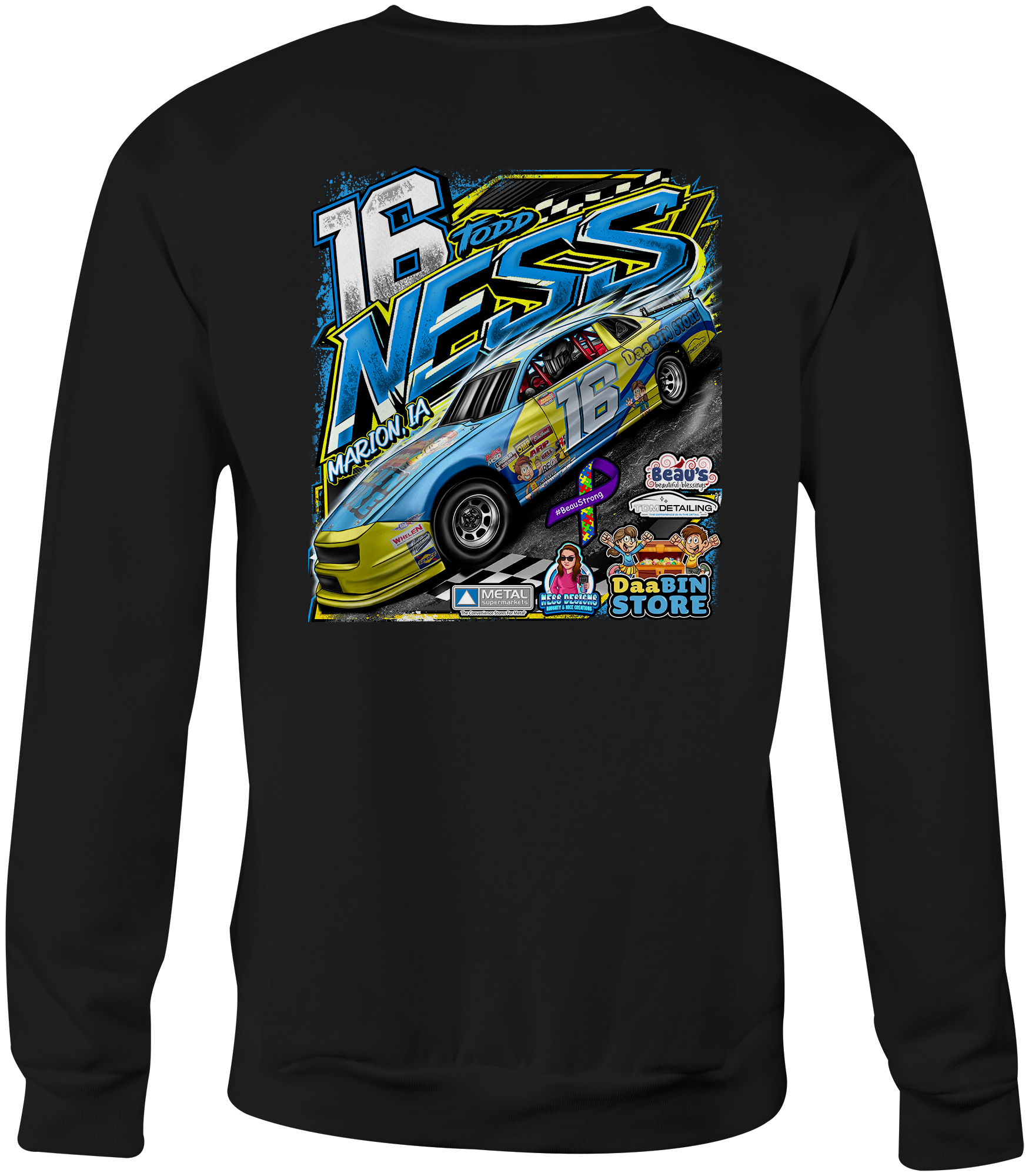Support Todd Ness with their custom apparel! Available in Black, Sport Gray, Royal Blue, Yellow and White. Graphics are direct to garment printed with a left chest image and a full back image.