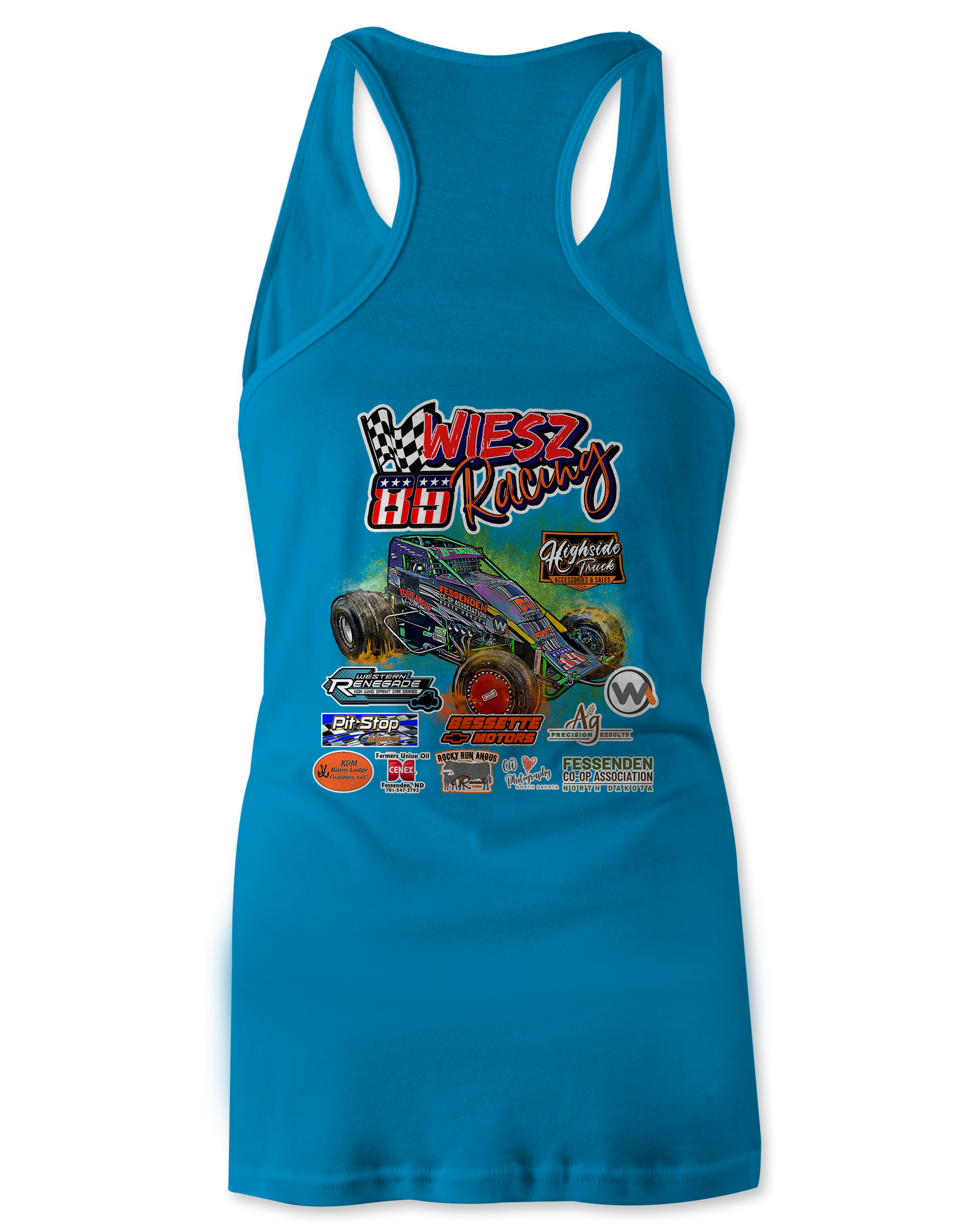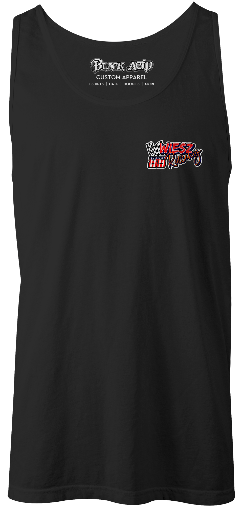 Support the Wiesz Racing Team with their custom apparel! Available in Black, White, Blue & Orange. Graphics are direct to garment printed with a left chest image and a full back image.